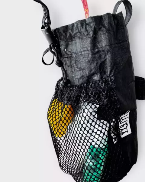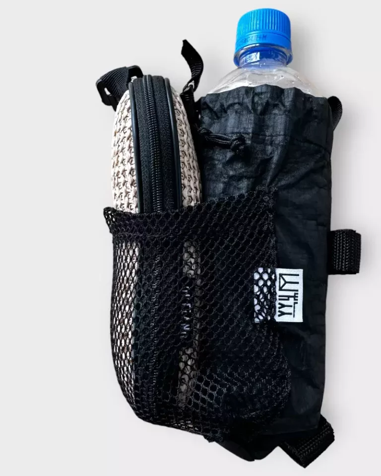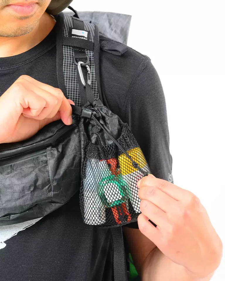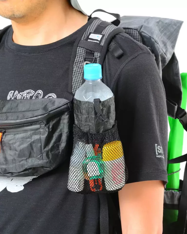 水筒はボトルホルダーに収納し、スマートフォンやカメラ、動画撮影機器などはサコッシュに収納。それ以外の行動食、サングラス、リップクリーム、日焼け止め、目薬をダイニーマショルダーポケットに収納しています。