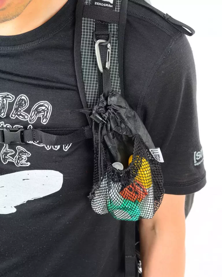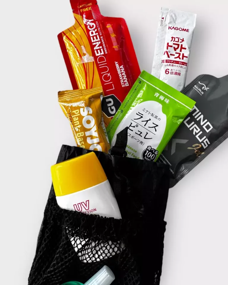行動食はメインポケットに入れています。プロテインバーやカロリーメイトなどがちょうど入る大きさで便利です。外側のメッシュポケットにはサングラスを引っ掛けたり、リップクリームや日焼け止め、目薬などを入れています。また行動食で出たゴミもメッシュポケットに入れています。