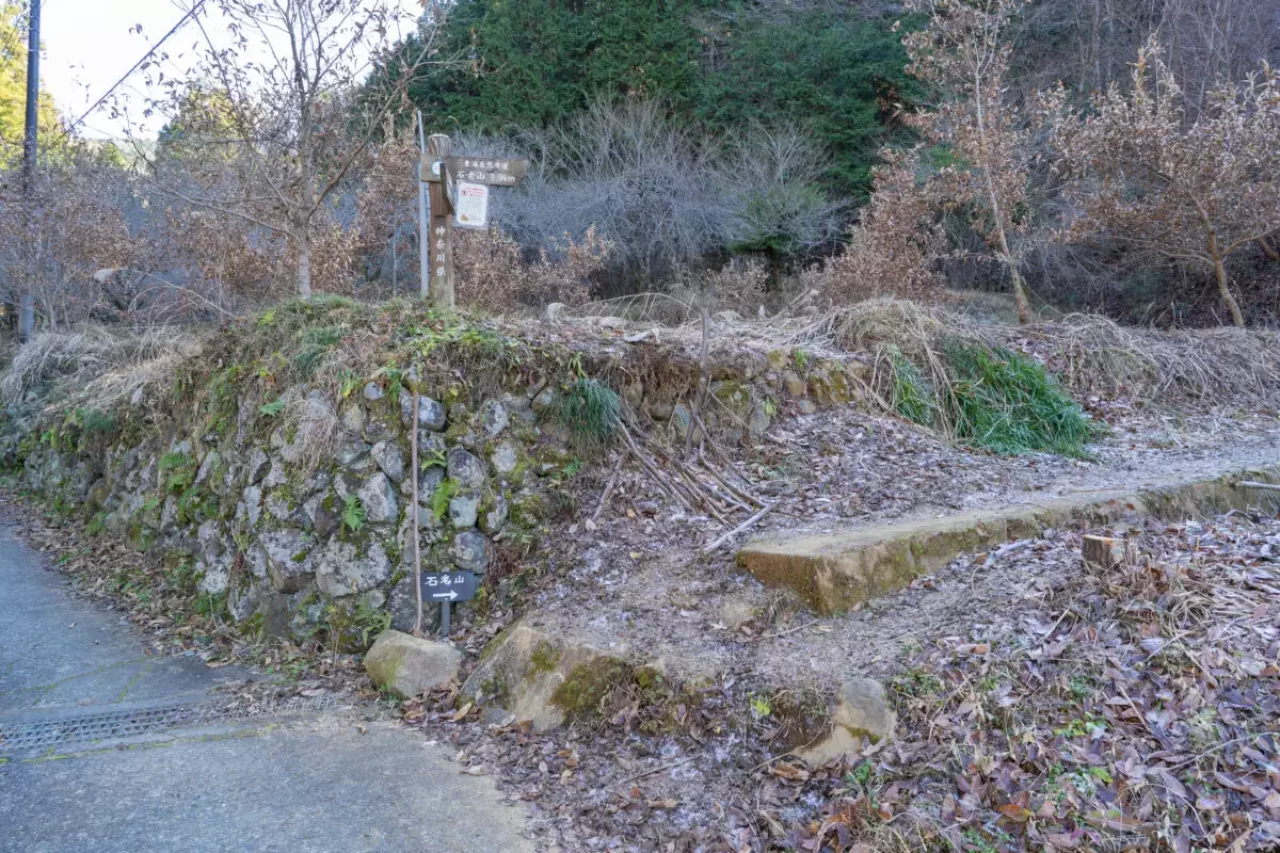 亀見橋を渡ってそのまま坂を歩いていくと、登りつめたところに右に折れる道が見えてきます。ここが登山口です。石砂山への道標に沿って民家の横を登っていきます。