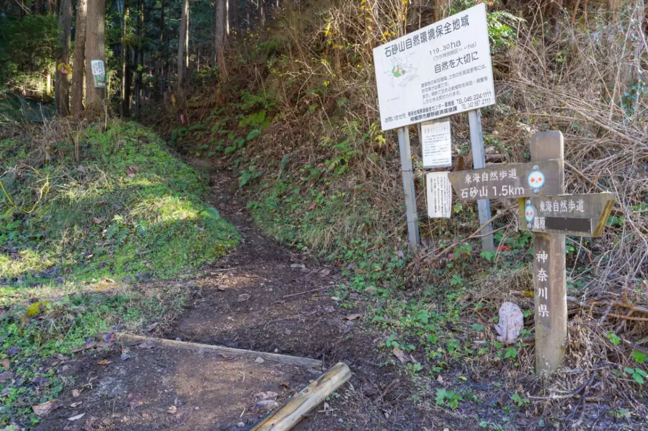 石砂山北側、篠原地区から東海自然歩道を歩いて石砂山へ向かうコースです。マイカーでアクセスしやすく、初心者向けの手頃な里山ハイクが楽しめます。