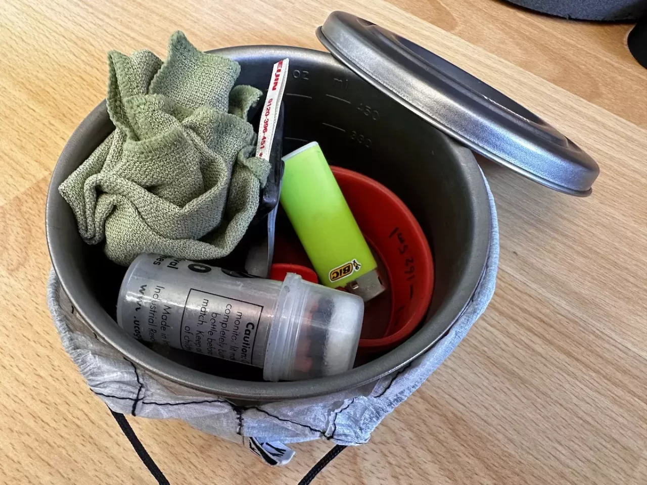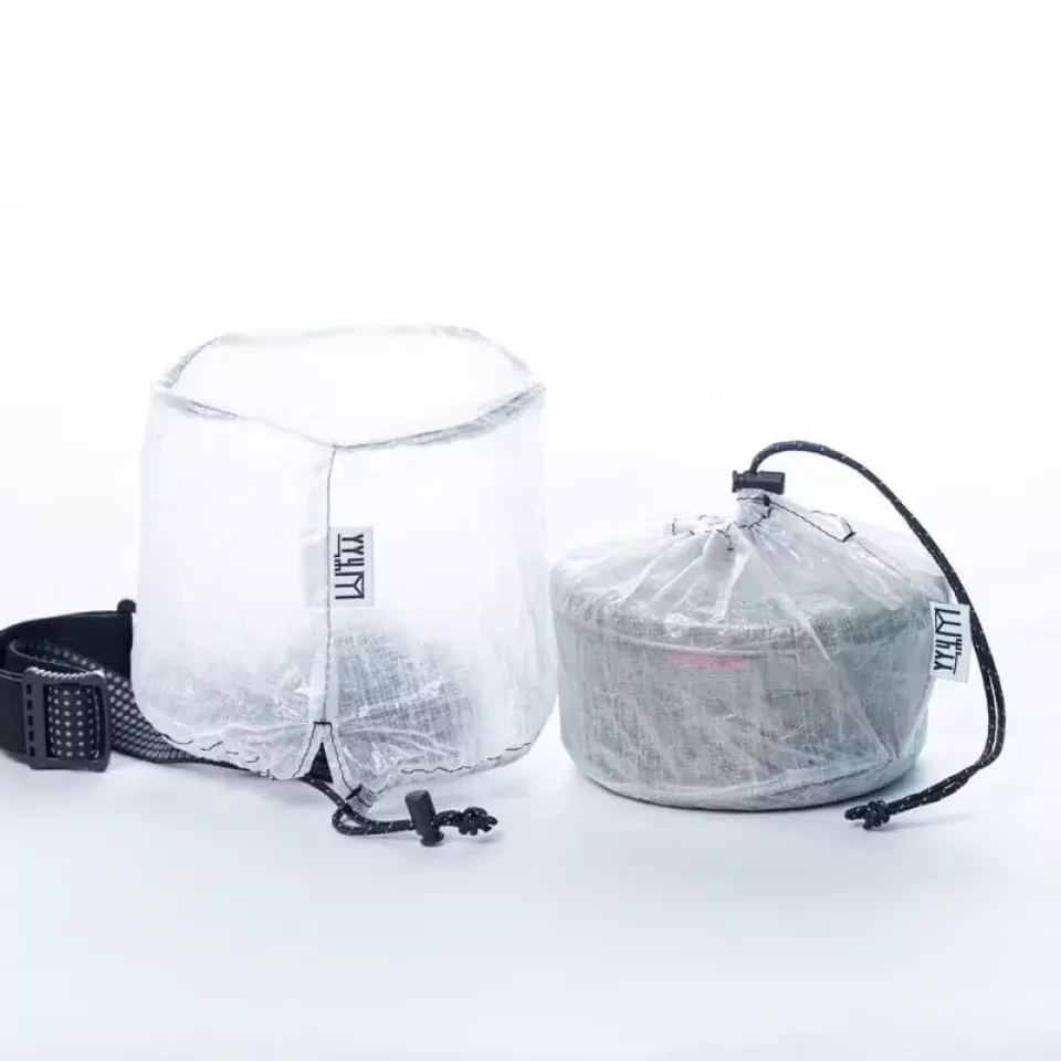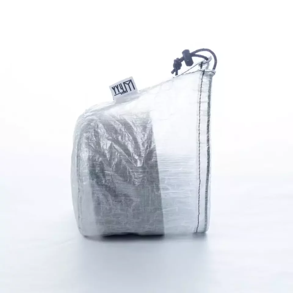 クッカーの中に固形燃料、五徳、ライター、マグカップを収納して蓋をして持ち歩くと蓋が外れてしまいます。そこで活用しているのは山旅ダイニーマ製クッカーケースです。このクッカーケースはエバニューTi570Cupを収納しやすいように、開口部が底部より広がっていてクッカーの出し入れがしやすくて、必須装備であるヘッドライトと組み合わせて使えばランタンシェードにもなる一石二鳥なアイテムです。4グラムと超軽量です。