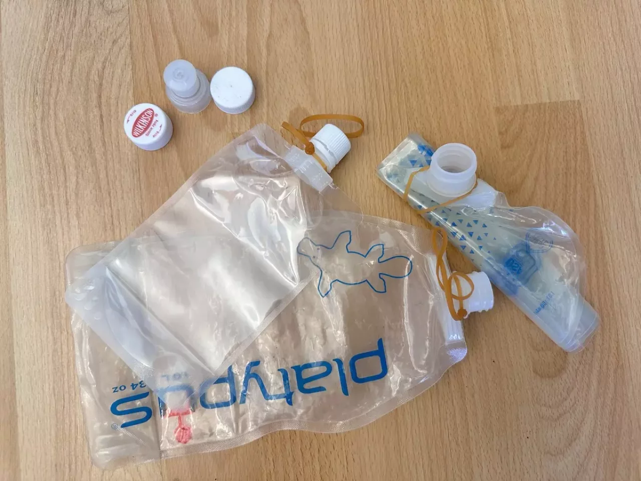 プラティパスはペットボトルの蓋を活用することができます。これを応用して僕は蓋の中心に小さな穴を開けたものをファーストエイドキットに加えています。これは細くて勢いのある水を傷口に当てて手を使わずに汚れを取るために使用します。こうすることで大切な水を少量に抑えることもできます。