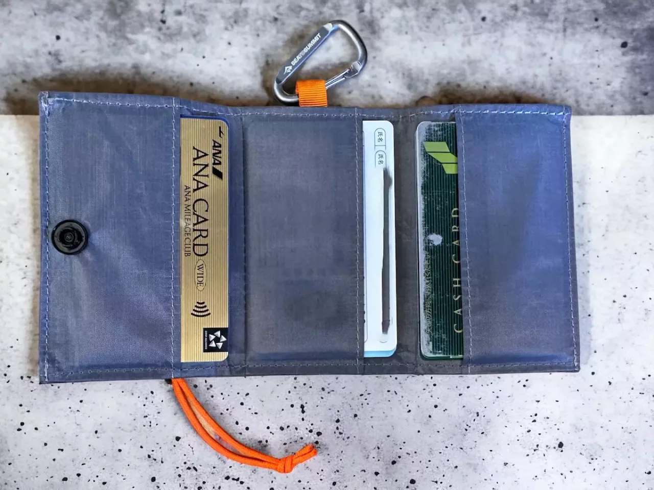 お札やカードを収納すると財布が浮いてしまってポケットなどに収納しづらいのですが、スナップボタンが付いているのでしっかりと固定して持ち歩くことができる以外に、中心にオレンジ色のループが備わっていてこの場所にカラビナを取り付けてキーループなどに取り付けておくことができます。これによって登山中になくす心配もありません。