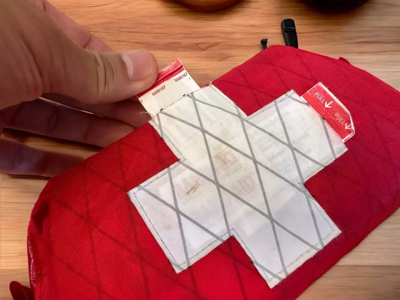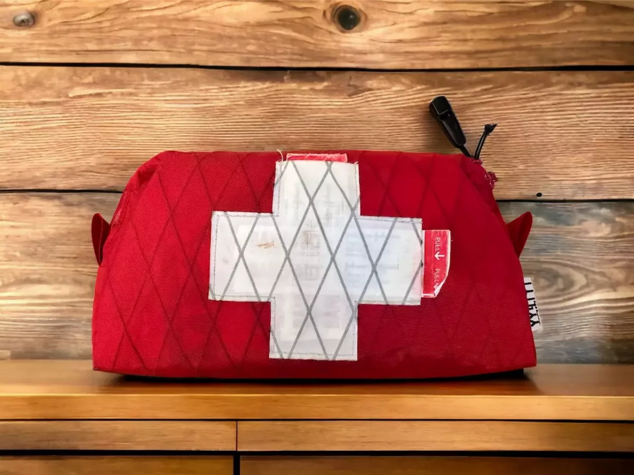 赤いX-PAC21という耐久性が高く保水しない素材で作られたファーストエイドキットポーチです。素早く中の物を取り出せるようにダブルジッパーで、どちらからも開閉が可能で、ジッパータブにホイッスルが付属されているので助けを呼ぶ時に使用することができます。