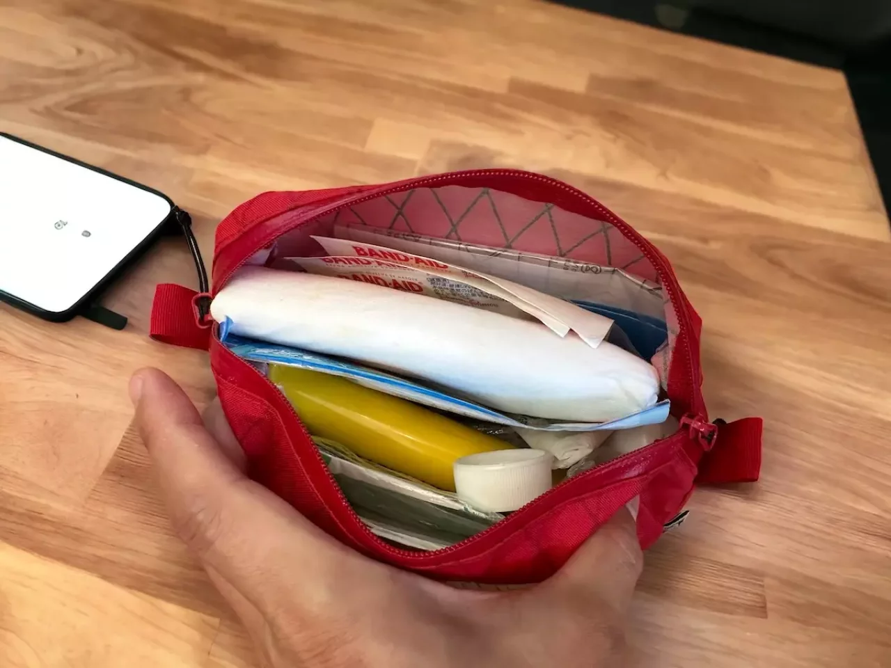 キューブ型だからポーチを開けた時に中のものを探し出しやすく、たくさんのファーストエイドキットを収納しておくことができます。登山以外で最も多く使用する可能性が高い絆創膏を十字部分に入れておくことができるので、探す手間を省くことができます。