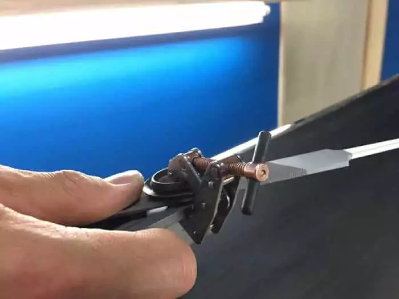 これはエッジを削る為のヤスリをガイドに止めるクランプだが、実に良く出来ている。一般的な挟んで止める物よりもしっかりとファイルをホールド出来てトラブルも少ない。何でも同じ事が言えると思うが、確実な道具を使えば仕上がりも滑りも違ってくるはず。