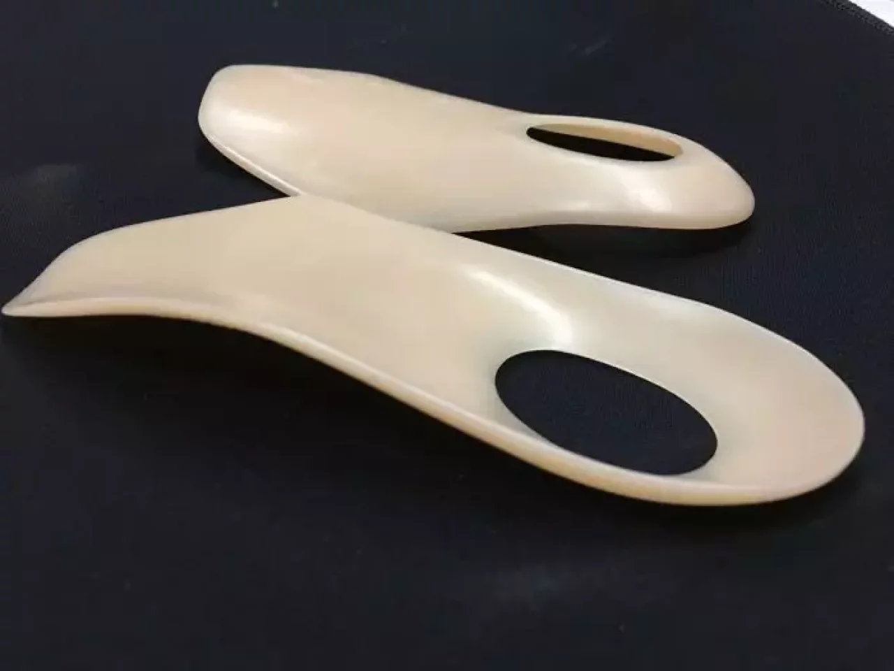 一般的に熱成形やコルク材を用いた快適性を求めるインソールが多い中、bi-op社のインソールは矯正を目的としている。一足ずつ型を起こしてプレス機で押し抜く技法を用い、強度が高くヘタらないので長期に渡り使用することができる。画像のインソールは普段用だが1998年製造の20年モノだ。高い精度で作られたフットベッドは高い安定性を生み、繊細な足裏感覚を養い、正確なボードコントールを可能にする。足裏が常に一定のポジショニングなので疲れも少ない。普段は見えない地味な存在だが、このインソールの存在は大きい。