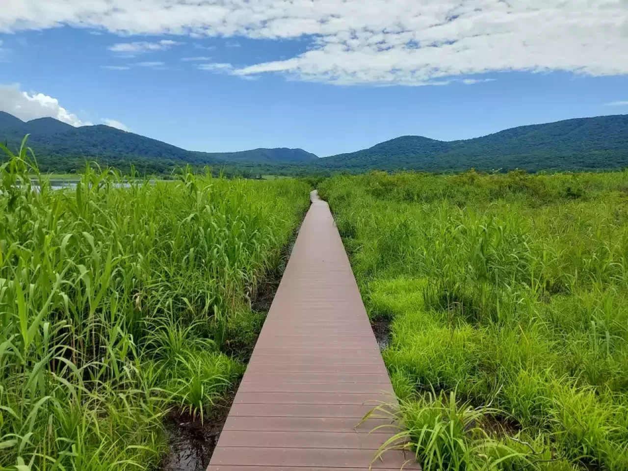 雄国沼では木道を反時計回りに周回。延びる木道、青空、山々の緑、風にそよぐ湖面のすばらしいコントラストを楽しみましょう。