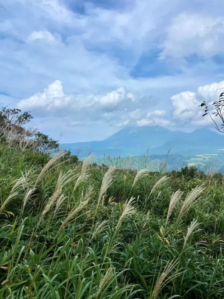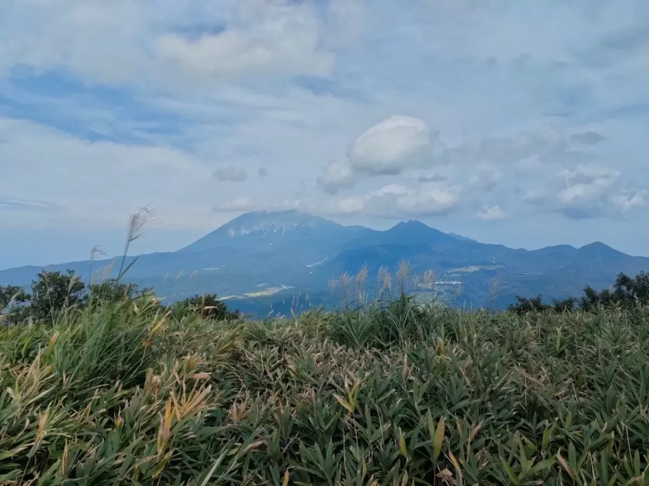 笹の海原、ススキの海。さっきまで吹き出ていた汗を乾かしてくれる心地よい風。眼下には蒜山高原の緑のじゅうたんが広がっているのも観えます。どこまでもこの道が続いて欲しい。