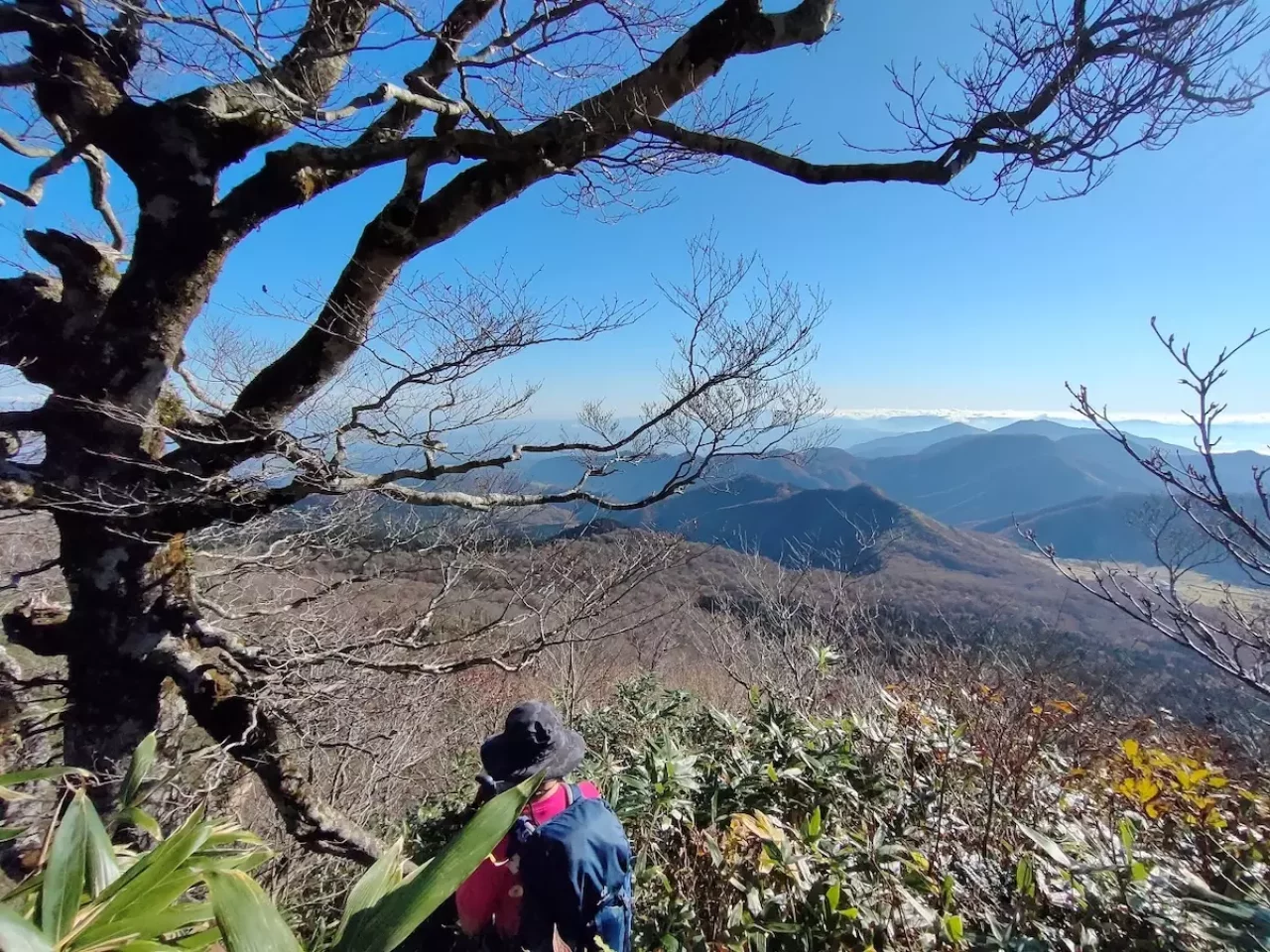 最初は森の中を歩きます。稜線に出ると途端に笹の藪こぎ、高度を上げるにつれすれ違うのも難しい狭い道となります。ふと振り返ると連なる山々と雲海の美しい風景広がっていました。