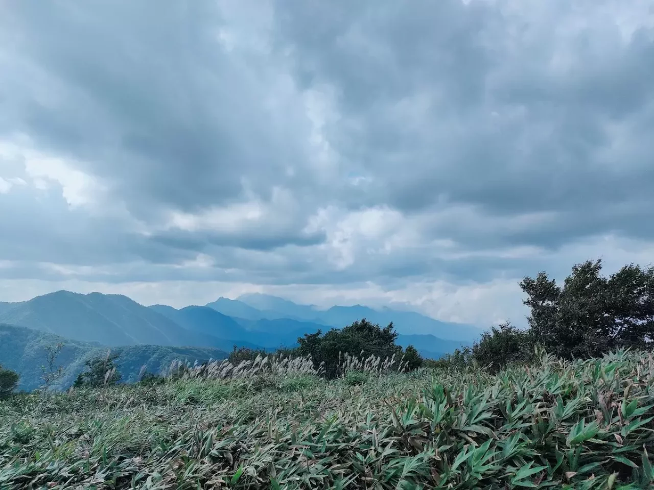 下蒜山の山頂に着く直前、山々が美しく連なっている景色が現れました。ゆっくりできるベンチがあるのでそこに座って笹の揺れる音を聞きながらしばらく眺めていました。