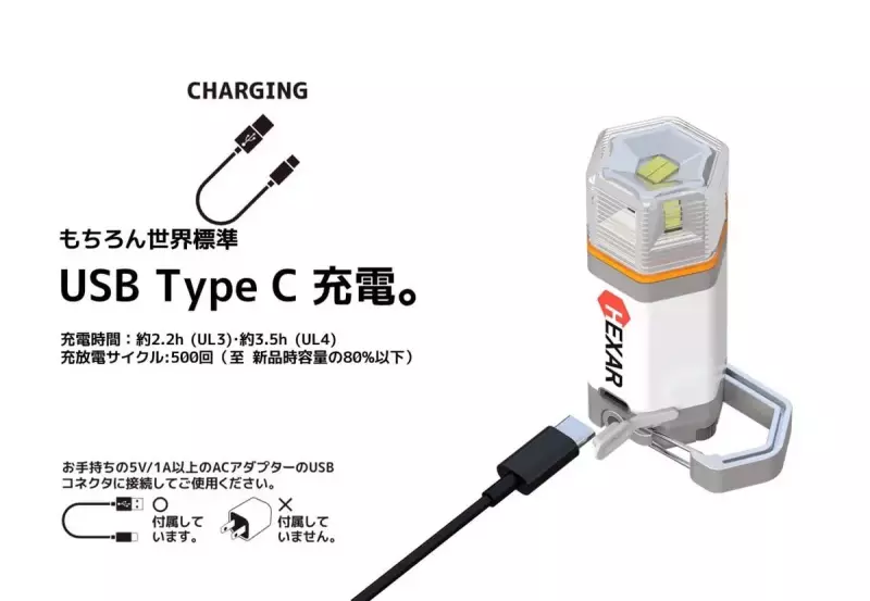 その中でも『HEXAR UL3』はUSB-C端子で充電が可能な最新モデルと言えるでしょう。また残りの充電容量がわかる点は登山で計画的にランタンを使う時には欠かせません。