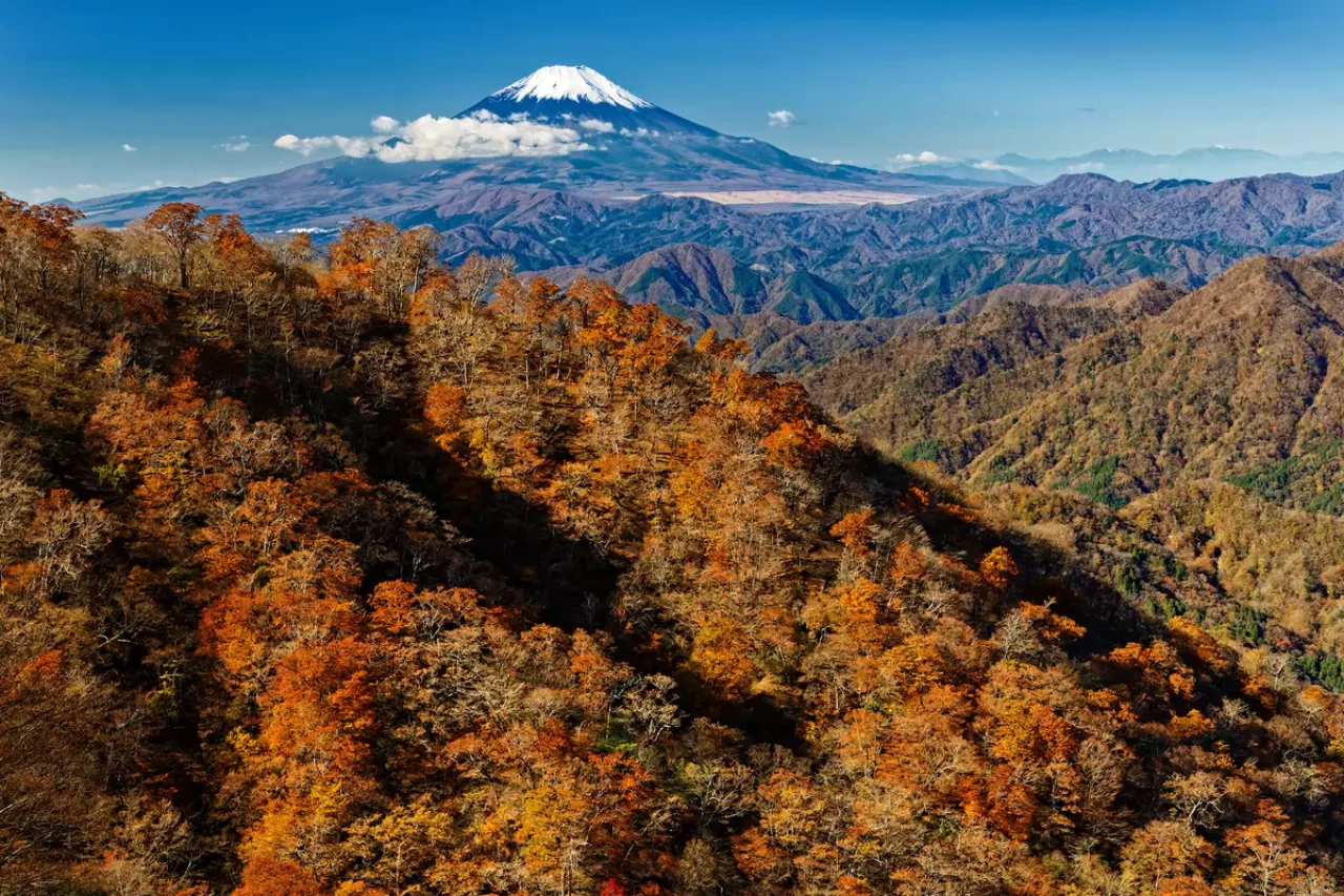 塔ノ岳をはじめ丹沢山塊の紅葉シーズンは、10月の下旬ごろから始まります。塔ノ岳の頂上は、開けた展望地になっており、一斉に紅葉した丹沢の山々越しに富士山や南アルプスの絶景が広がっています。山頂部からの景観はもちろんのこと、ふもとの秦野戸川公園から続く登山道周辺もきれいに紅葉しており、まさに紅葉登山を楽しめるでしょう。