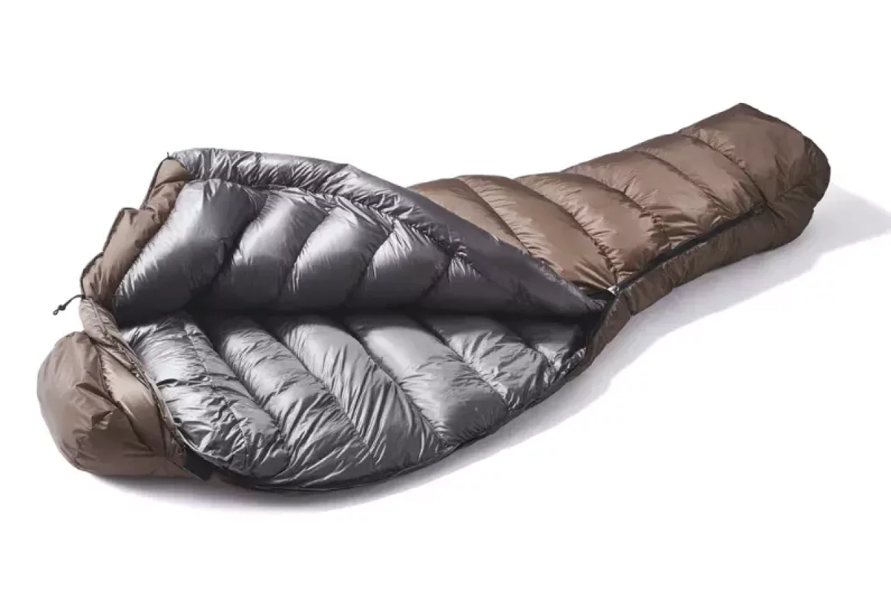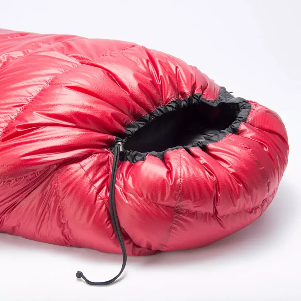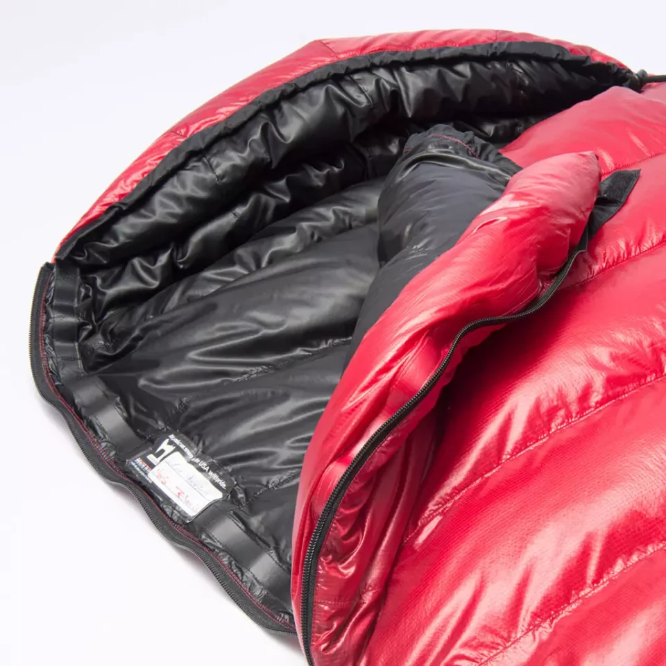 軽量コンパクトを追求した保温性に優れたシュラフです。体を温めるべき胴から上はボックス構造で、ダウンが移動しづらいように縦型バッフルを配置し、下半身には軽量化のためにシングル構造で横型バッフルを配置しています。