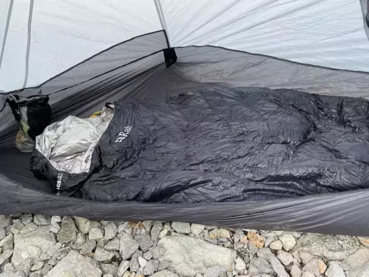 シュラフの上にかぶせることでシュラフカバーのような役割で結露による濡れ、冷気の侵入を抑制することができる。