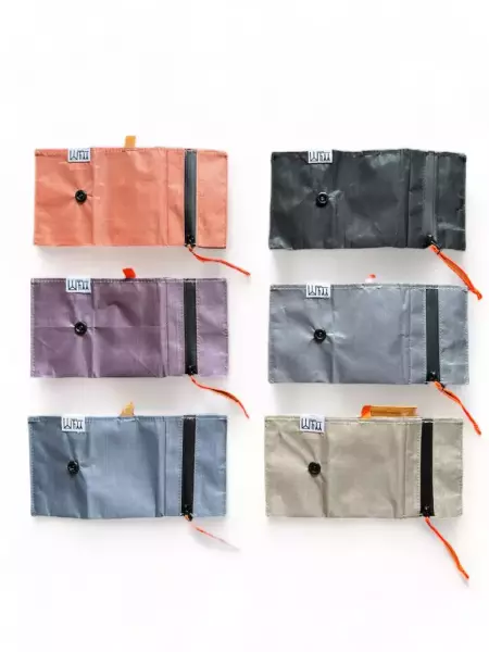 2023年から販売し始めた山旅の3つ折り軽量ウォレットは6色展開です。ブラックは定番カラーですが他のカラーについては売り切れたら終了の可能性もあります。ダイニーマにオリジナルのカラーで色付けした場合は素材価格が非常に高くなるため、それによって販売価格も上がってしまいます。そのようなことを避けるためにカラーは、その年に色付けしたものを仕入れています。