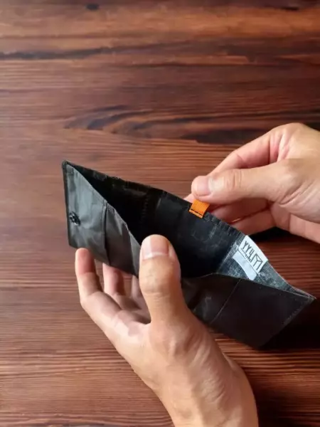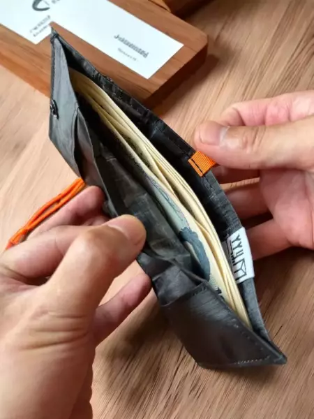 このダイニーマには様々な厚みの素材があります。耐久性が高いとは言え、0.9oz以下のダイニーマは使い続けているうちに穴が開くことがあります。個人で作っているダイニーマアイテムの多くが0.8ozぐらいの薄い素材なので気をつけて購入しましょう。山旅の3つ折り軽量ウォレットは2.92ozの厚みのある張りが高い素材を使用しています。これによってカバンやポケットの出し入れで擦れることが多い財布を破れから守ります。