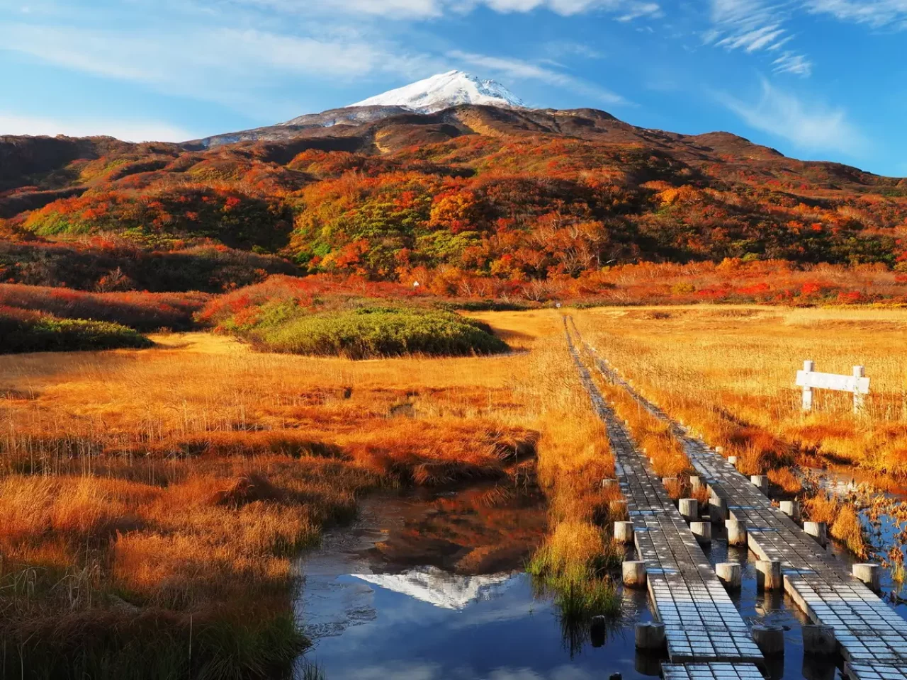 八幡平は9月下旬ごろから色づきを初め、10月には見頃を迎えます。山頂付近をダケカンバとヤマモミジが色づきを始め、カラフルに山を染める様子は圧巻です。見どころは湿原の草紅葉、木道を楽しみながら歩けます。