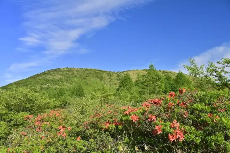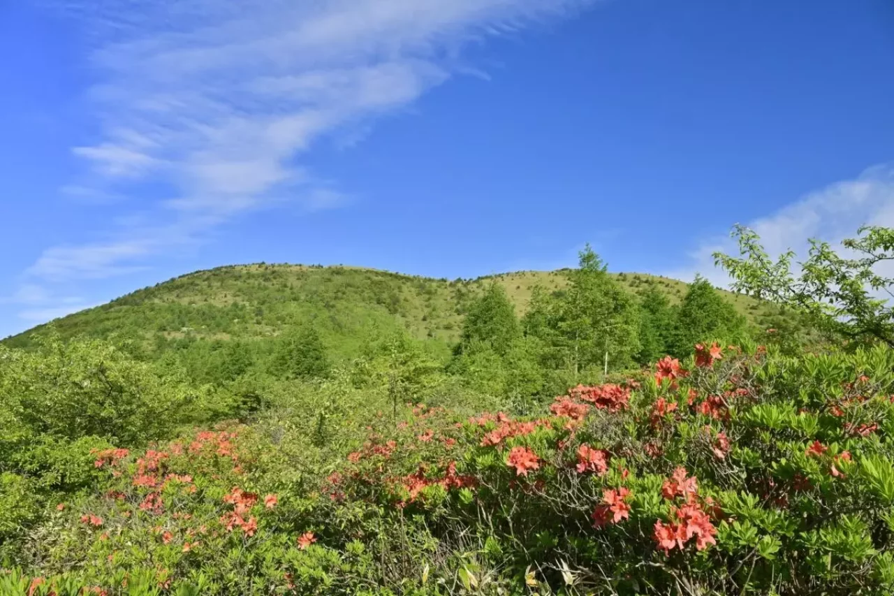 山頂手前には、約60万株にもおよぶ湯の丸レンゲツツジ郡落があり、毎年6月下旬ごろのシーズンになると山肌を朱色に染め上げます。この光景は非常に壮観で、毎年多くの観光客が訪れます。