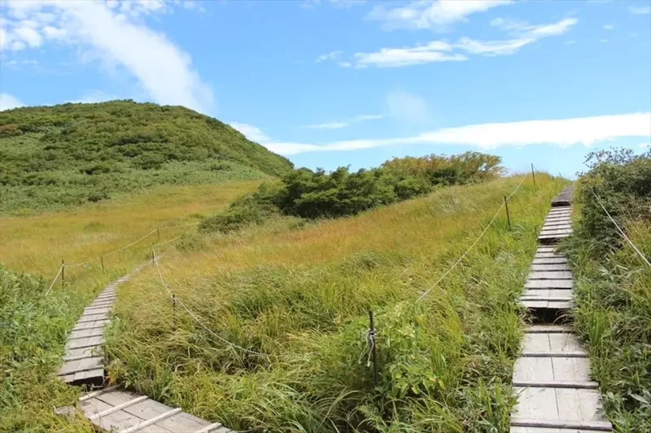 前岳付近からの草原の中を伸びる木道と天狗の庭のすがすがしさ。秋になれば草原は、あざやかな黄金の草紅葉に変わります。「いつまでもここにいたい」とあなたもきっと思うはずです。