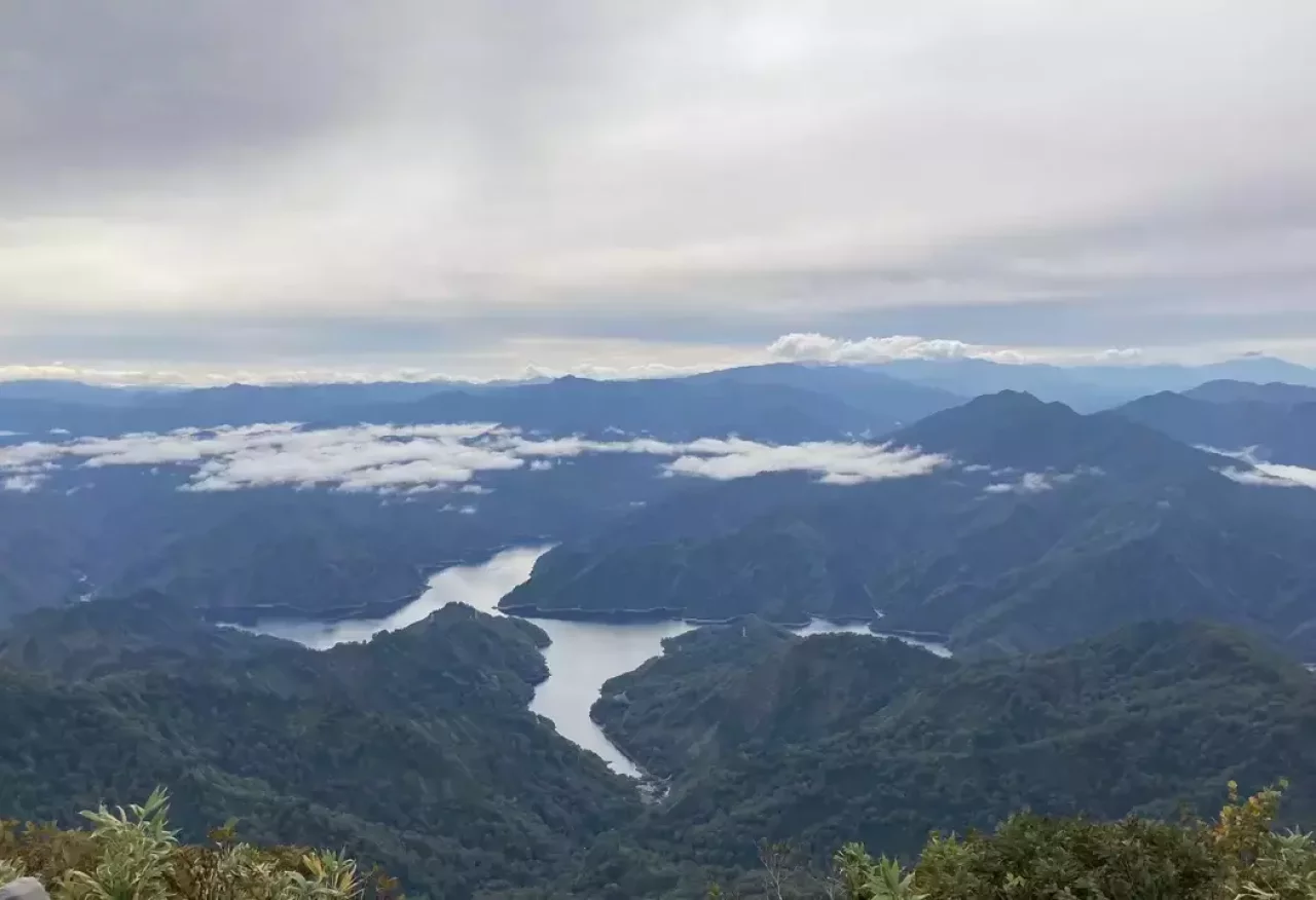 山頂からは360°のパノラマビュー。鬼が面山の迫力ある岸壁と十字型の田子倉湖、そして越後三山がドーンと控えます。少し離れて燧ケ岳も。