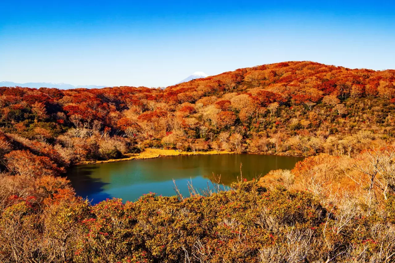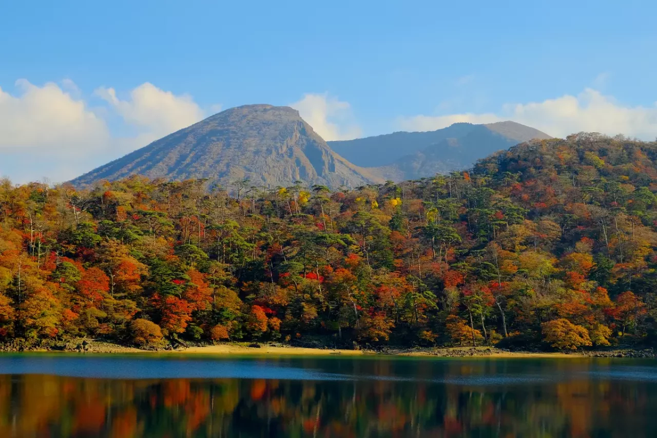 霧島火山の最高峰である韓国岳は「日本の紅葉百選」に選定されるほどの名所です。山頂付近から後ろを振り返ると、美しい紅葉と壮大なパノラマが待ち受けており、心が震えること間違えいなし。