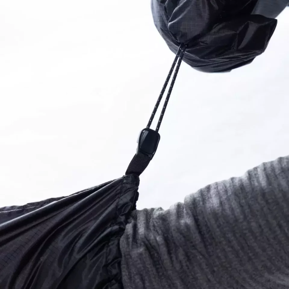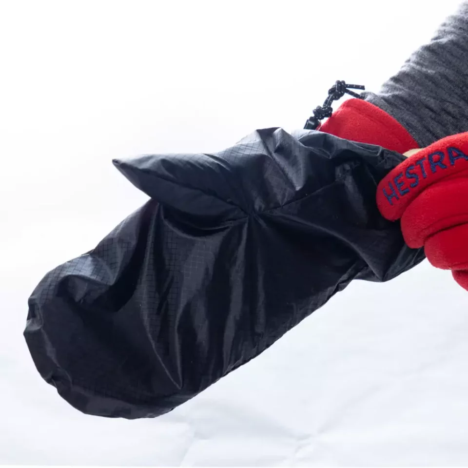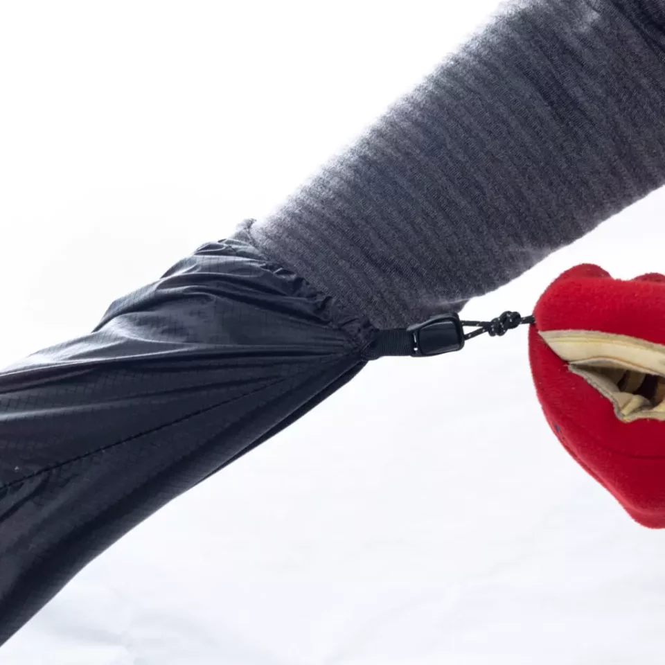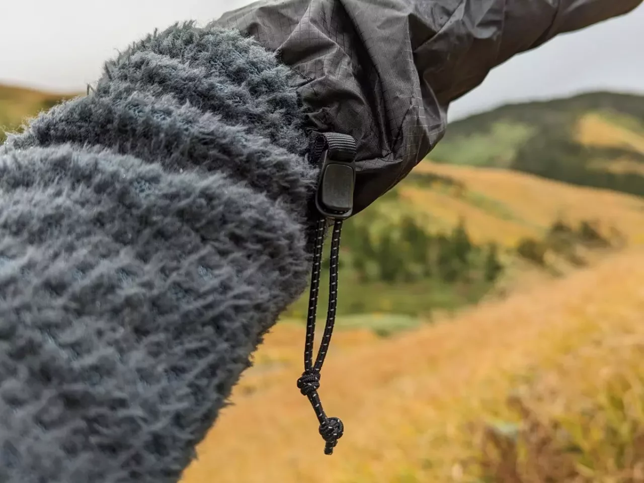 山旅防風ミトンの中に冷えた空気が入らないように素早くミトンの開口部分を締めることも重要です。山旅防風ミトンは、ミトンをしてからストレッチコードを引っ張るだけでグローブを絞める&緩めるを簡単に行うことができます。