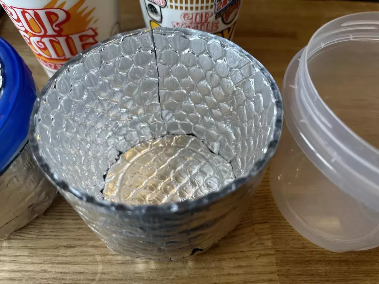 これらのスクリューロック容器にアストロフォイルを使った保温ケースを本体に、蓋の部分にアストロファイルを両面テープで貼り付けたのが今回紹介するアイテムです。