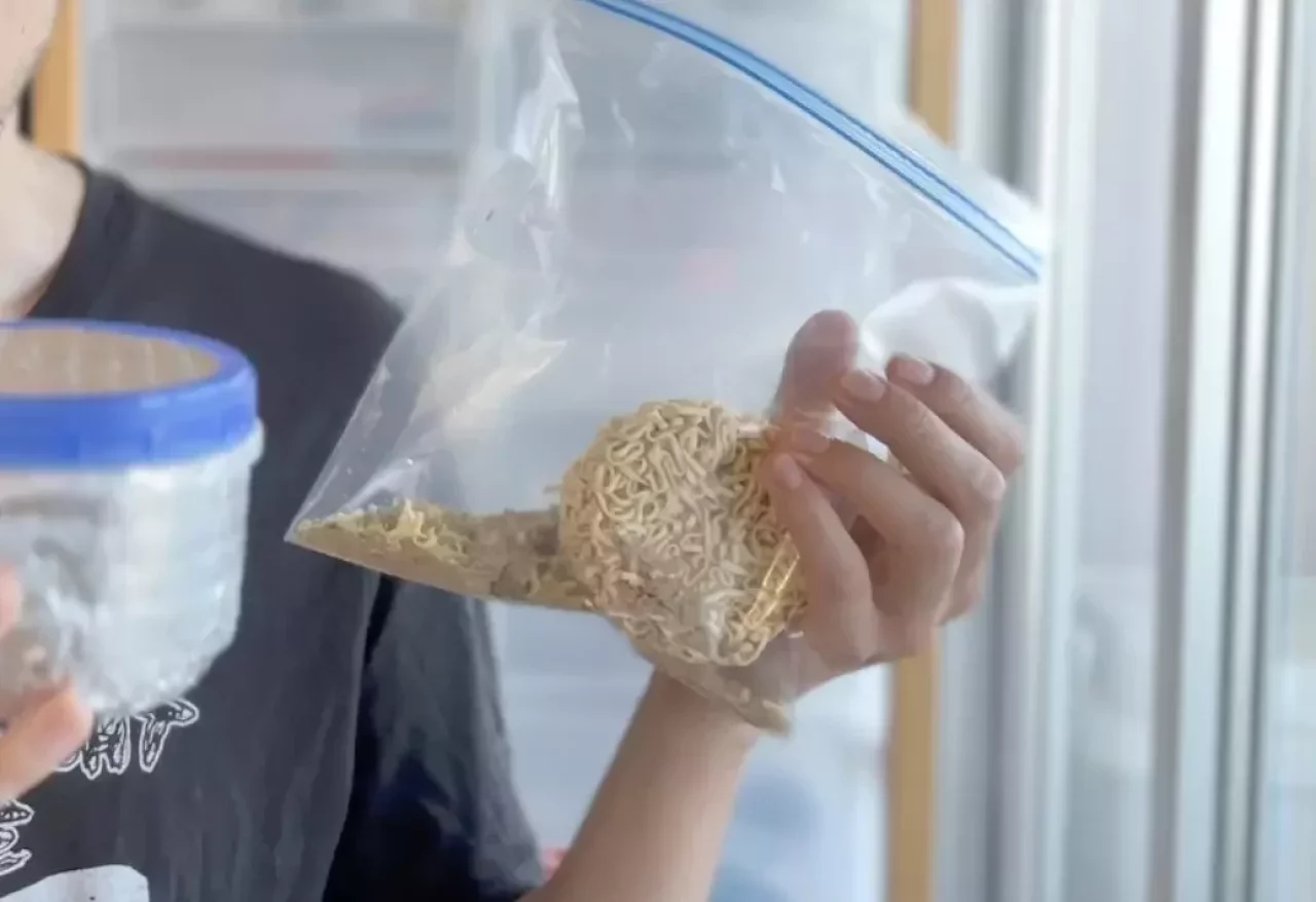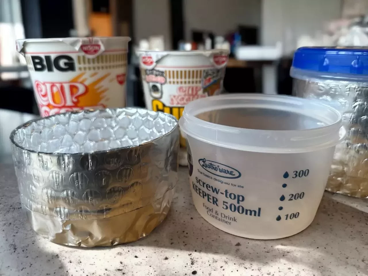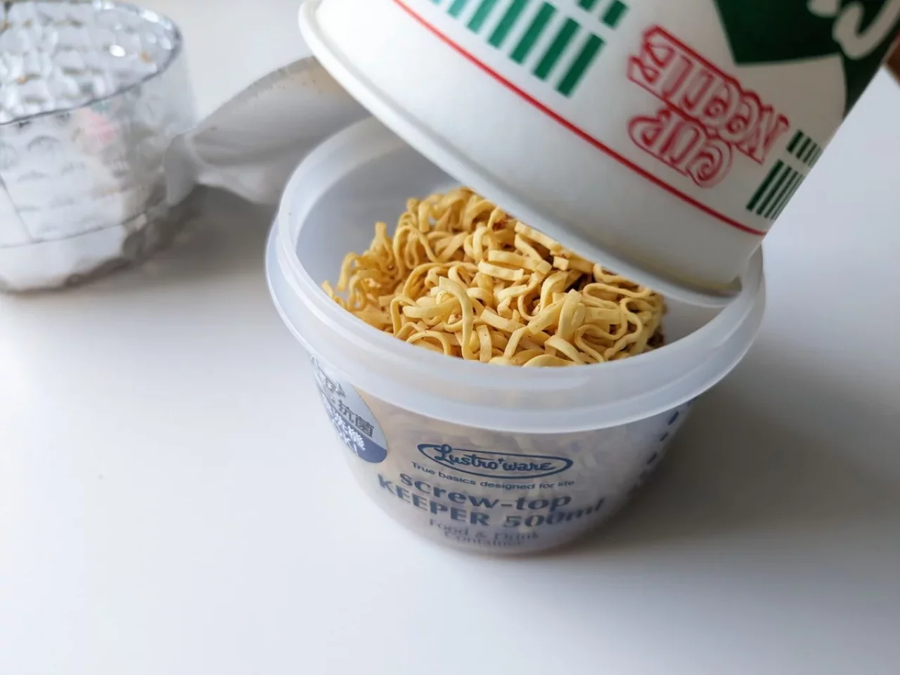 スクリューロックコジーを手に入れたら、カップラーメンの中身をスクリューロックコジーに移し替えます。こうすることでゴミは事前に捨てることができます。