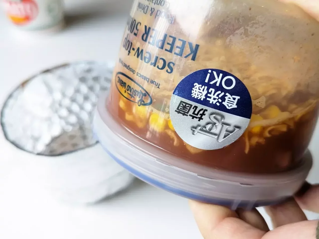 またカップラーメンで出た余ったスープは飲めないから持ち帰りたいといったニーズがある方は、Lustrowareスクリュートップキーパーだと蓋にパッキンがついていて密閉力に優れているので、汁がこぼれないと保証するものではありませんがこちらの選択がおすすめです。Lustrowareスクリュートップキーパーにはメモリがついているのでお湯をどこまで入れたら良いかわかるのもジップロックのスクリューロックにはない特徴です。容量は500mlです。