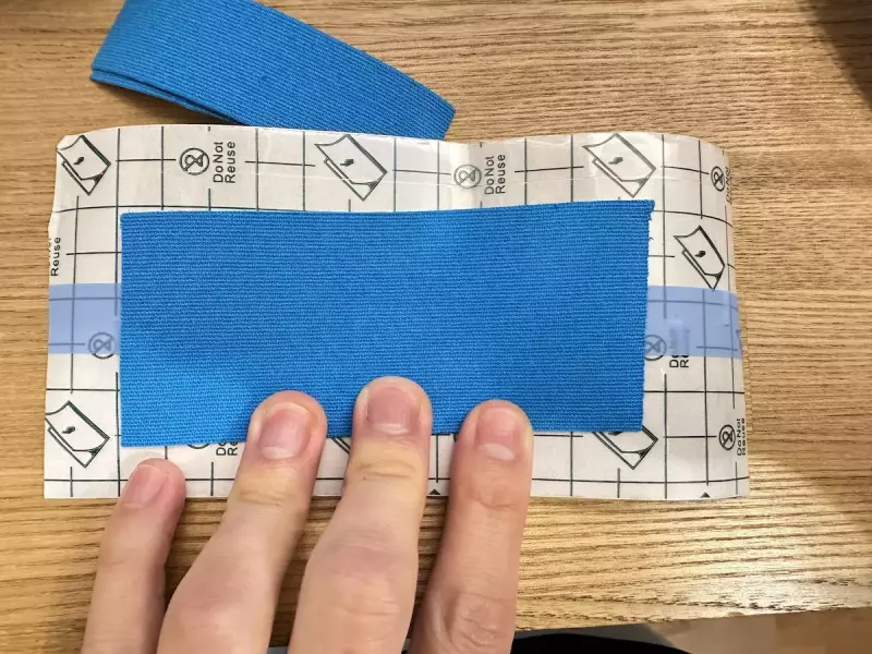 この大きさのテープ以外にも大中小、短い・長いなどで3種類ぐらいの大きさでテープとフィルムを準備しておきます。またカットした伸縮テープもフィルムを剥がれないようにするために角を丸くしておきます。