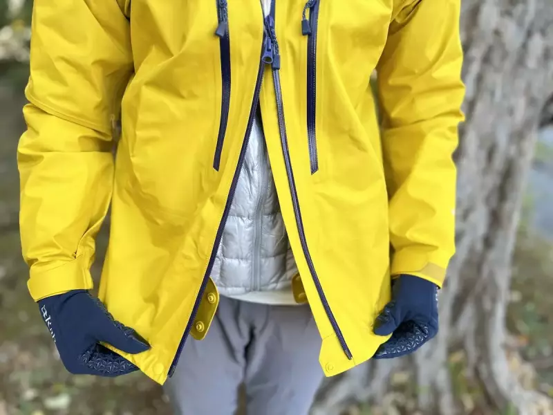 フロントジッパーにはダブルジッパーが採用されているので、上からも下からも開くことができ、ハーネスを取り付ける時にロープ操作に干渉しにくい仕様です。また上からも下からもジッパーを開けてジャケット内の汗蒸れを素早く排出することもできます。最下部にはスナップボタンが付いているので、ジッパーを開けた時に風でバタつかないように止めておくことができます。