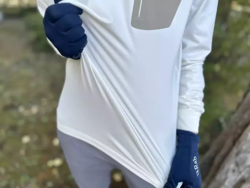 何と言っても肌に当たる内側の起毛素材が非常に気持ちよく、動きやすさもあって寒い季節のベースレイヤーに最適な着心地です。この素材は非常に吸湿性に優れているので、水滴になる前の肌から出る湿気を素早く吸収し肌をドライに保ってくれます。