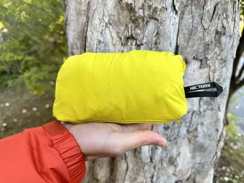 ポケットは左胸にスマートフォンや行動食を収納しておける大きさのポケットが備わっており、このポケットを使ってパッカブルすることができます。パッカブルをした時のサイズは素人採寸で、幅約17cm、高さ約10cm、厚み約7.5cmの大きさになります。