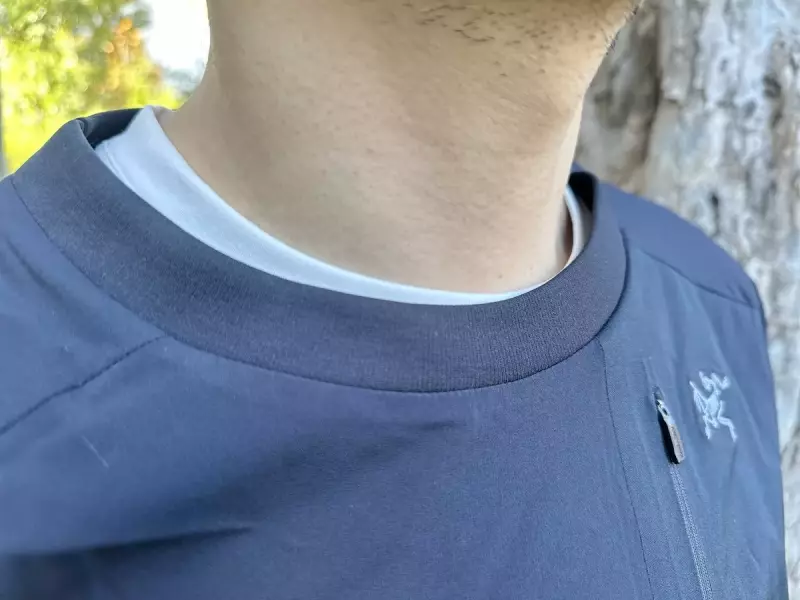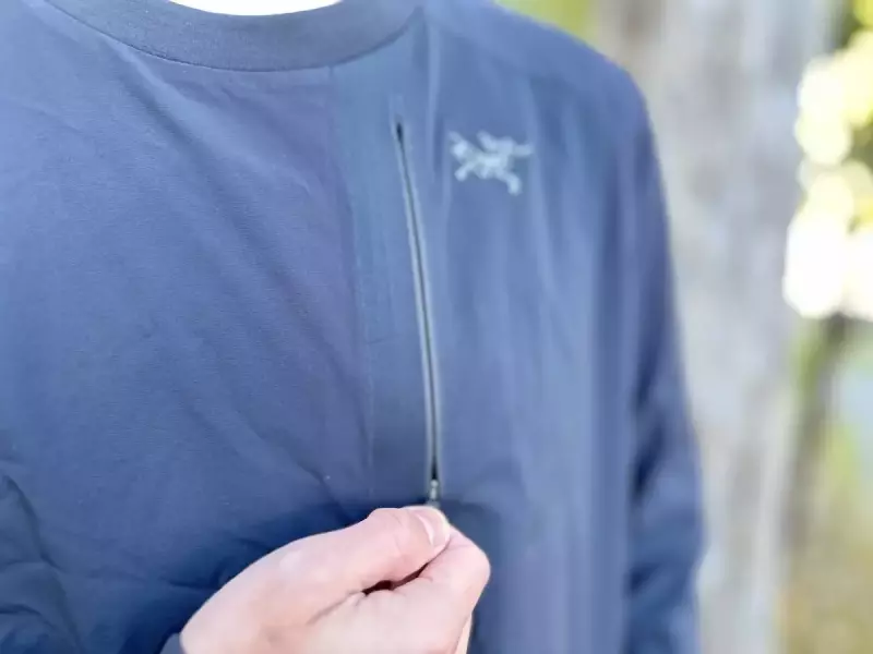 クルーネックプルオーバータイプでトレーナー感覚で普段使いしやすいデザインです。胸元にはジッパー付きのポケットが備わっており、耐久性に優れたストレッチする素材によってスマートフォンなどの大きなガジェットを収納することができます。またポケットはラミネート加工によってゴワつき感が一切なく、スマートなデザインに仕上げています。
