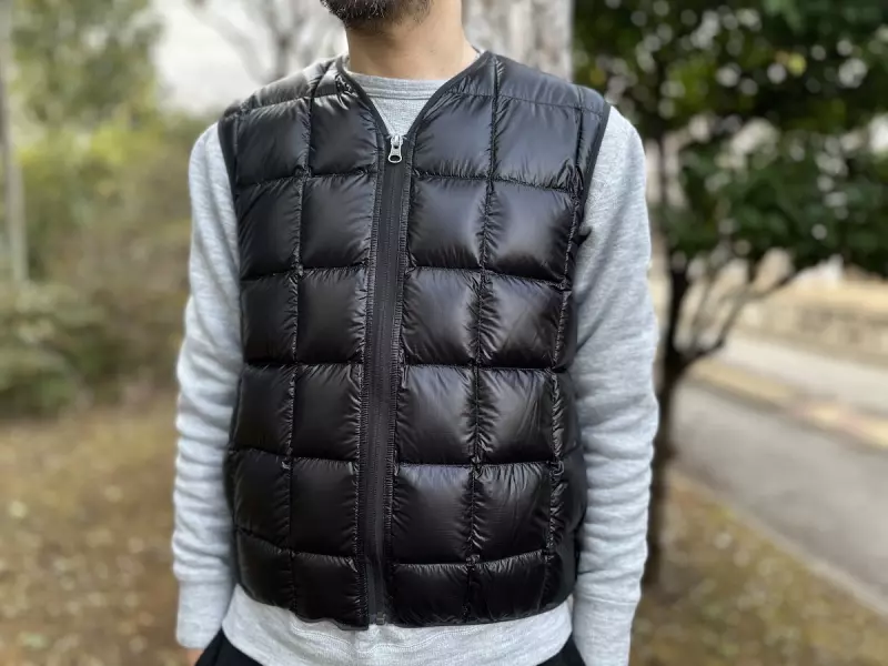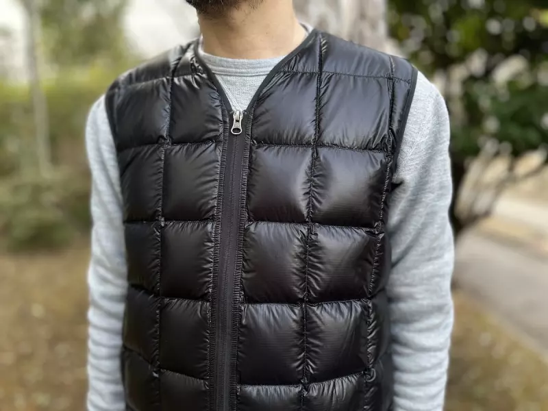 また普段使いとしては、ダウンジャケットを着用しながら食事をしたり運転をするのは気が引けますが、ダウンベストであればずっと着用し続けていられる良さがあります。フラッシュベストはモコモコしすぎず、非常に軽量で、首回りもすっきりしているので着用していることを忘れてしまうようなアイテムで、仕事中も運転中も、自宅での休憩にもずっと着用して体を暖かくしてくれる手放せないアイテムです。