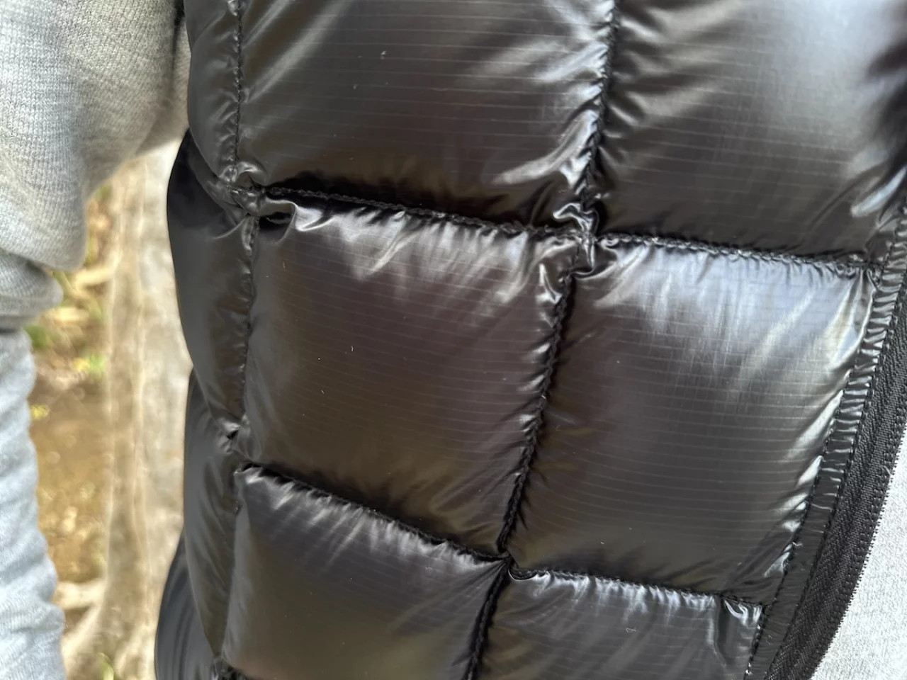ダウン重量はMサイズで35g、表生地には0.9ozのリップストップナイロンを使用しています。この表生地は高強度でダウン抜けも少ない特徴があります。雨を弾く加工でダウンを濡れから守ります。