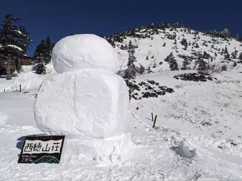 名物の巨大雪だるま。ここから西穂丸山まで20分程度、奥の小高い登りに向かいます。