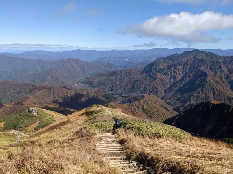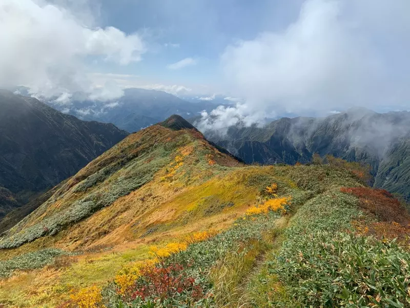 森林限界を超え視界が開ければそこは、色とりどりの紅葉の中。抜群の眺望によって、ピークを目指しながらも絶景の連続。シャッターを切る回数が増え足が進みません。