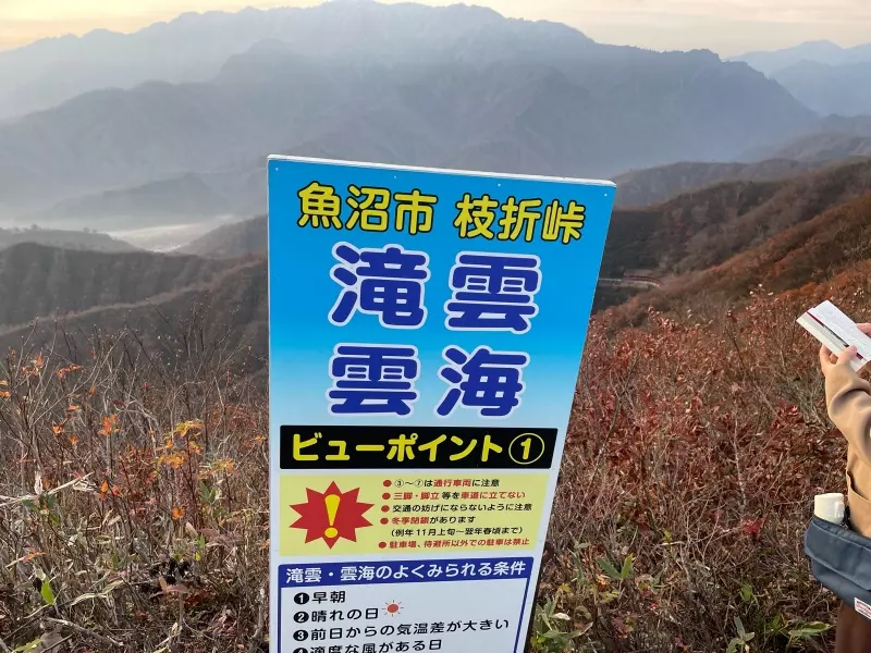 絶好の鑑賞ポイントは「枝折峠(しおりとうげ)」。大湯温泉から銀山平温泉へと続く国道352号線沿いにあります。多くの写真家がその時を狙ってカメラを構えていますが、ここは越後駒ヶ岳への登山口にもなっています。