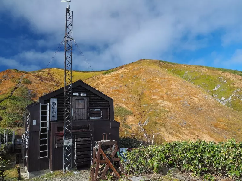 駒の小屋の営業期間は5月中旬から10月中旬、期間外は避難小屋になります。宿泊する際は協力金として一人2,000円、広場にテントを張る際は協力金500円必要です。トイレ使用可能、水場2か所あり、収容人数は40人。