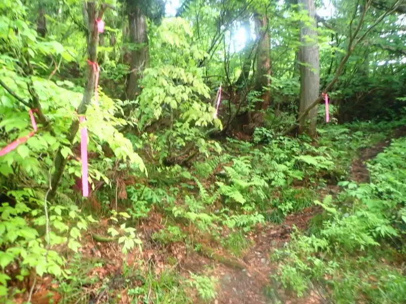 まずは車道を歩き、川沿いを経て林道に出ます。まもなく道行山への登山口(道行新道)がありますので見落とさないように。(ピンクテープが巻かれているので大丈夫です)
