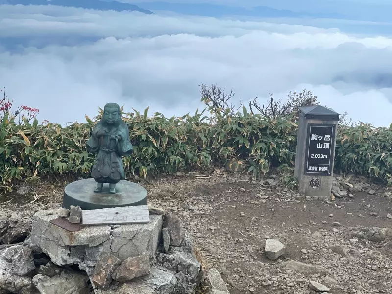 越後駒ヶ岳山頂には、「豊斟淳尊(とよくむぬのみこと)」(猿田彦命とも言われます)の銅像があります。一等三角点も設置されています。