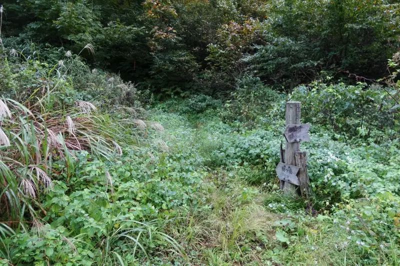 駒の小屋から山頂までは比較的なだらかな斜面。左から回り込むように進み、途中、中ノ岳への分岐を通ります。この辺りは草原が広がり気持ちよく歩けます。