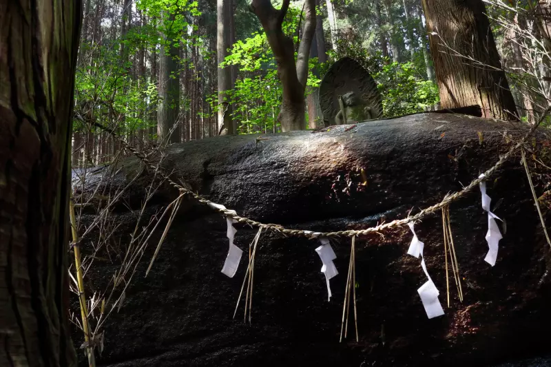 竪破山には奇岩・巨岩信仰があり、登山コース上にはさまざまな奇石、巨石が点在しています。なかでも山頂付近にある太刀割(たちわり)石は、直径7mの巨石がまるで刃物でスパッと切られたかのように真っ二つに割れていることで有名です。
