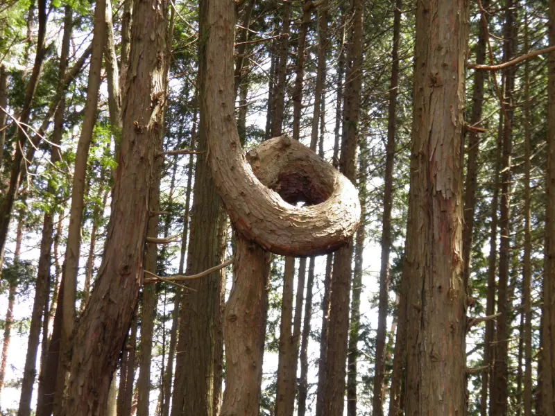 山頂手前にある七ツ岩は、眺望の良いビューポイント。また、幹が1回転しているユニークな木は一見の価値アリです。