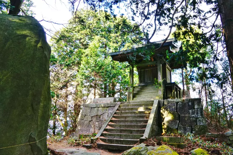 この巨石には、源義家が大太刀を一振りして割ったという言い伝えがあり、竪破山の見どころの1つとなっています。そのほかにも伝説やいわれのある奇石・巨石がいくつかあり、山頂には黒坂命(くろさかのみこと)が祀られた黒前(くろさき)神社があります。
