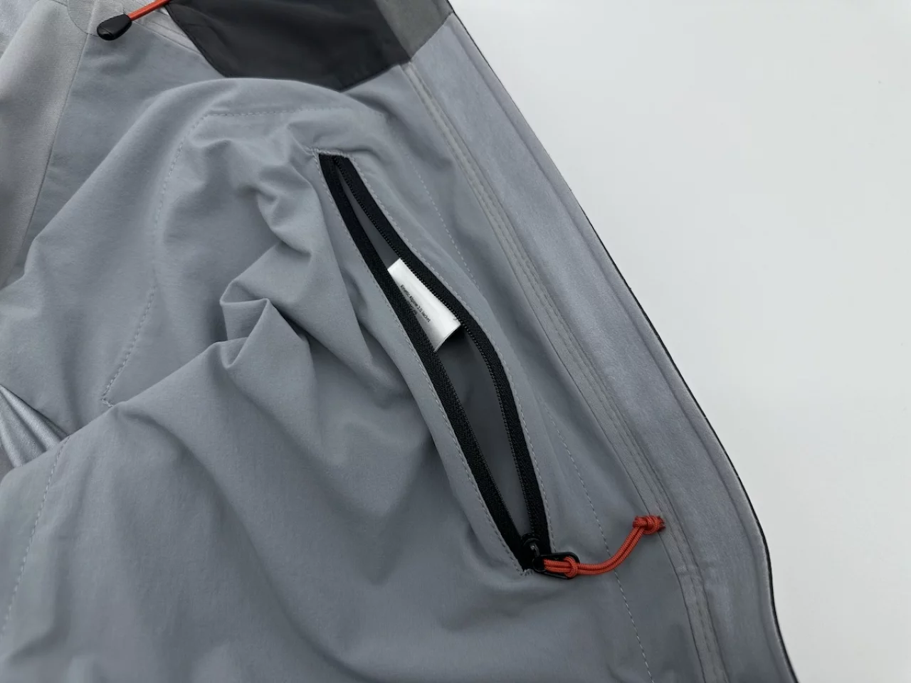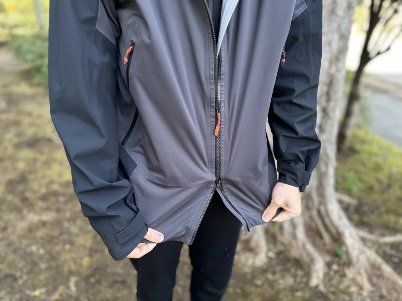 フロントにはダブルジッパーが備えられており、小雨程度の天候時や、キネティックアルパイン2.0ウィンドブレーカーのような使い方をしている時に、フロント部分の通気性を確保するのに非常に便利です。このジッパーは耐水性の高いYKKのアクアガードジッパーで、安心感が高いのですが、少しジッパーが固いです。なので僕はジッパーワックスを塗ってファスナーの滑りを良くしています。