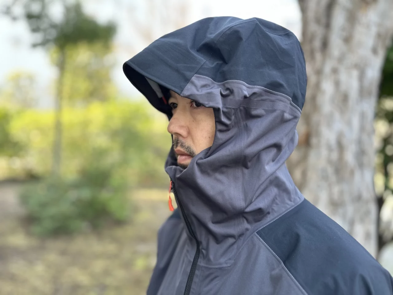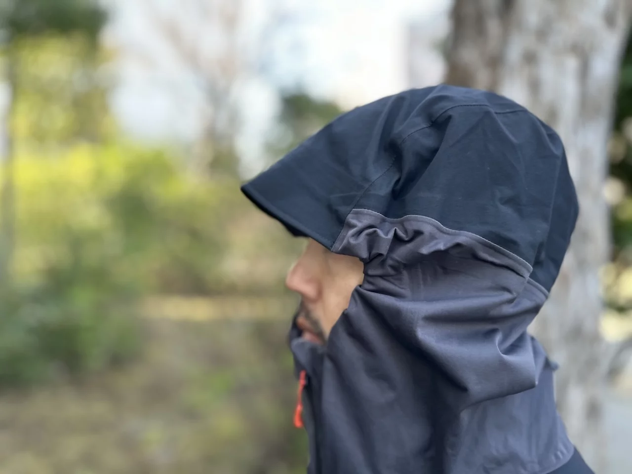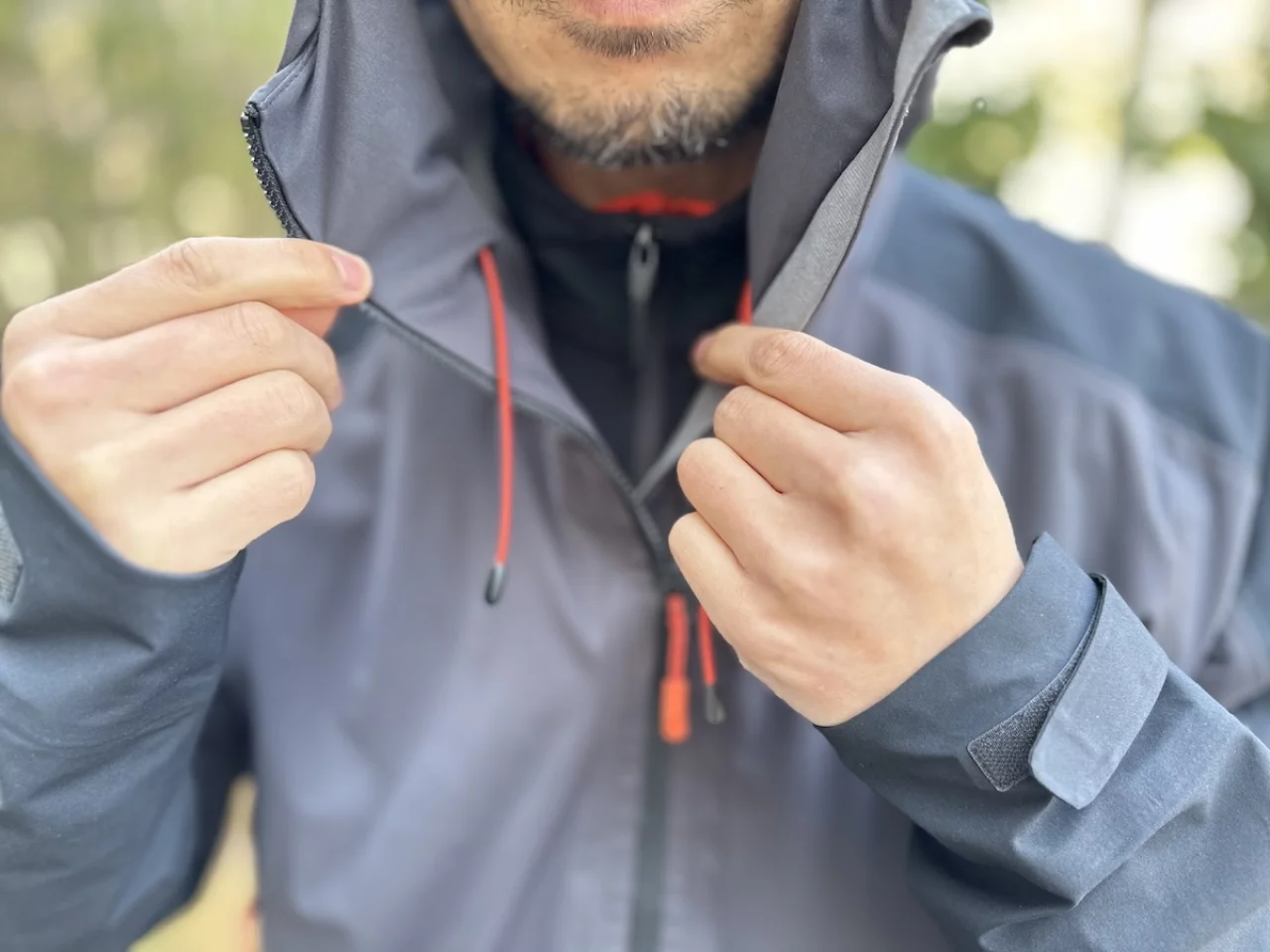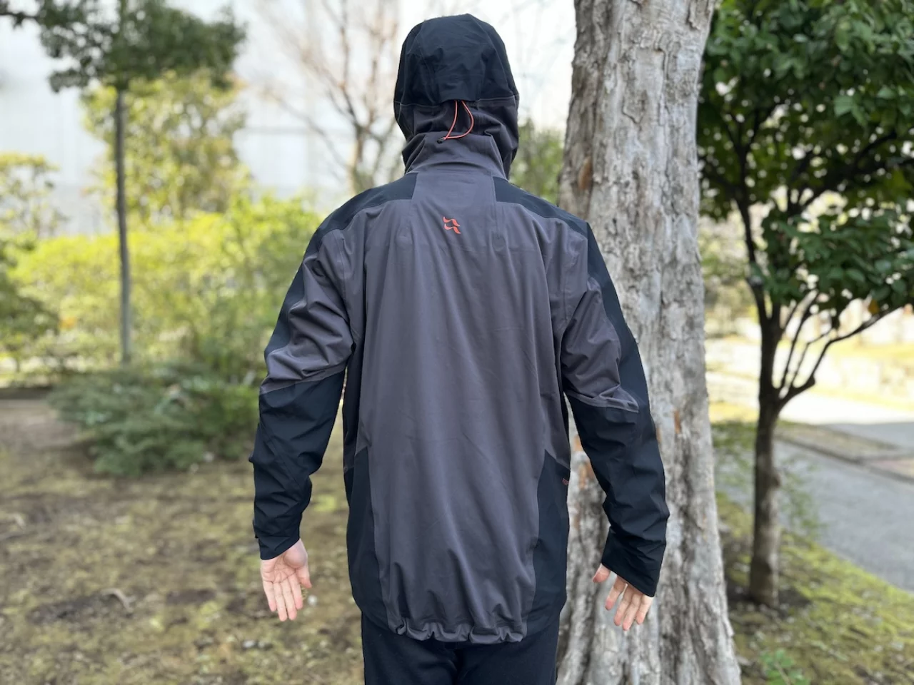 3つのキネティックジャケットの中で唯一ヘルメットの上からフードをかぶることができるデザインを採用しています。フードをかぶっていない状態でも頭にしっかりとフィットするように、後頭部に設けられたドローコードで頭の周囲にフィットし、さらにフードの側面の調整を可能にするドローコードが左右に備えられています。