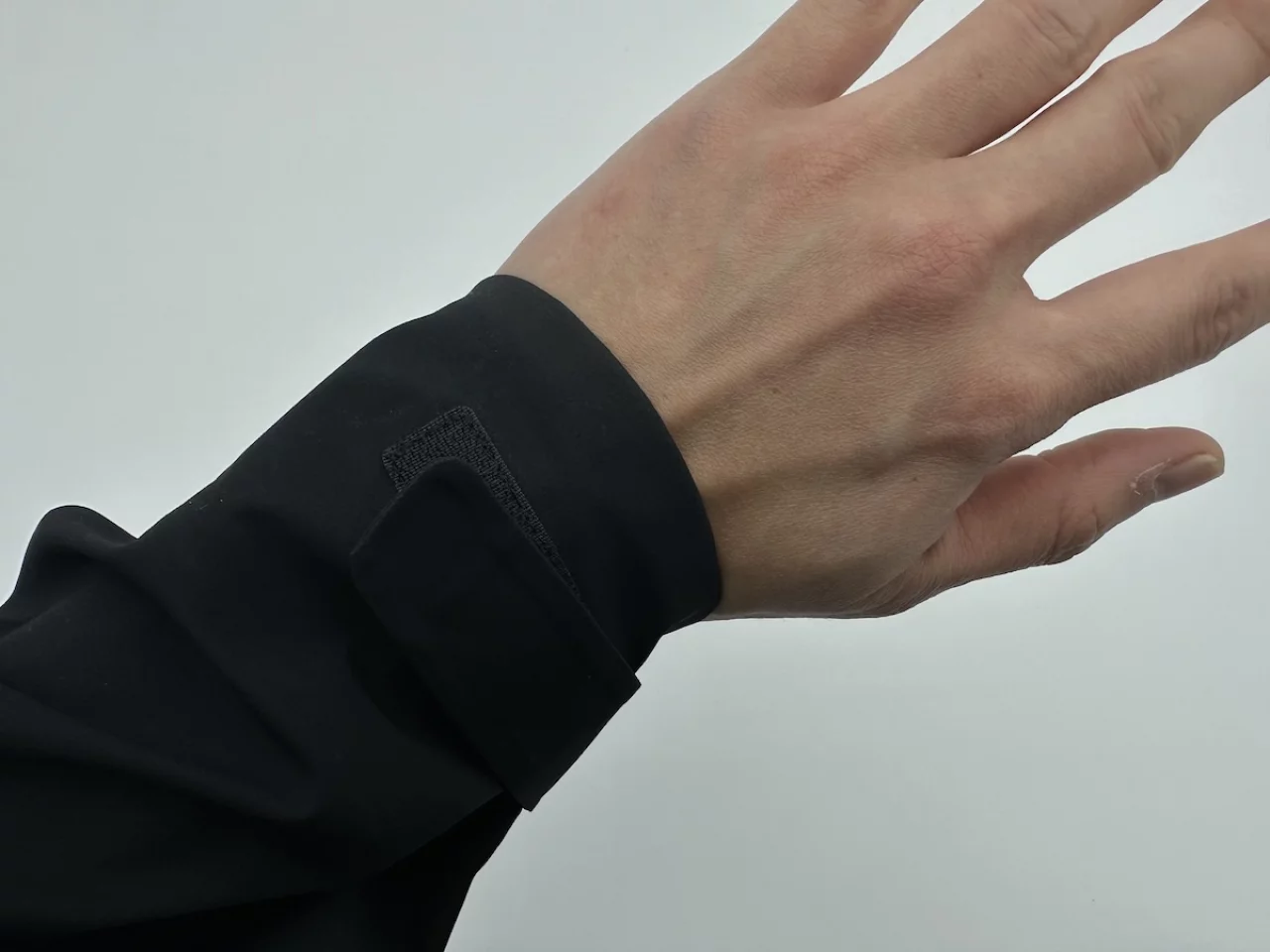袖口のフィットはベルクロテープで行います。このベルクロテープの内側には、幅広の起毛素材が貼られており、ベルクロテープでフィットさせた時に、手首に気持ちよく心地よさがあります。そして手の甲側はラウンドしており他のジャケットと比べてもフィット感がとても良く感じます。これは実際に着用してみて是非感じてもらいたい優れたデザインです。